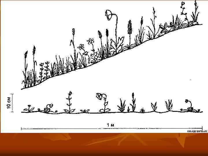 вверху - хорошо прогреваемый склон южной экспозиции; внизу - горизонтальный участок плакора (флористический состав одинаков)