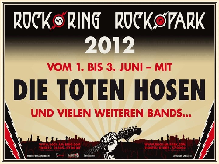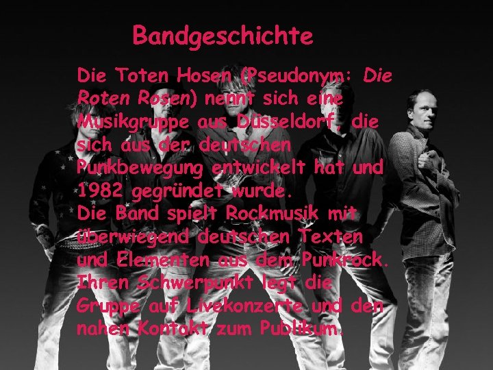 Bandgeschichte Die Toten Hosen (Pseudonym: Die Roten Rosen) nennt sich eine Musikgruppe aus Düsseldorf, die sich aus der deutschen Punkbewegung entwickelt hat und 1982 gegründet wurde. Die Band spielt Rockmusik mit überwiegend deutschen Texten und Elementen aus dem Punkrock. Ihren Schwerpunkt legt die Gruppe auf Livekonzerte und den nahen Kontakt zum Publikum.