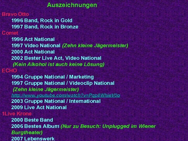 Auszeichnungen Bravo Otto 1996 Band, Rock in Gold 1997 Band, Rock in Bronze Comet 1996 Act National 1997 Video National (Zehn kleine Jägermeister) 2000 Act National 2002 Bester Live Act, Video National (Kein Alkohol ist auch keine Lösung) ECHO 1994 Gruppe National / Marketing 1997 Gruppe National / Videoclip National (Zehn kleine Jägermeister) http: //www. youtube. com/watch? v=Pqp 8 Whie. V 0 o 2003 Gruppe National / International 2009 Live Act National 1 Live Krone 2000 Beste Band 2006 Bestes Album (Nur zu Besuch: Unplugged im Wiener Burgtheater) 2007 Lebenswerk