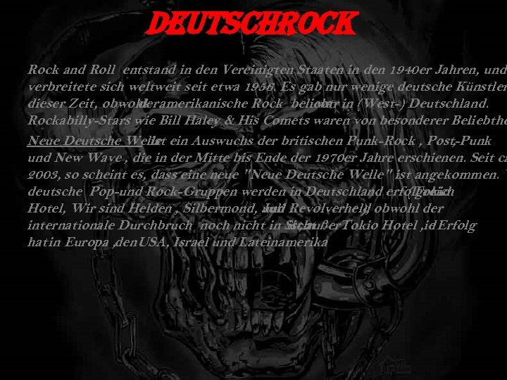 Deutsch. Rock and Roll entstand in den Vereinigten Staaten in den 1940 er Jahren, und verbreitete sich weltweit seit etwa 1956. Es gab nur wenige deutsche Künstler dieser Zeit, obwohl amerikanische Rock beliebt in (West-) Deutschland. der war Rockabilly-Stars wie Bill Haley & His Comets waren von besonderer Beliebthe. Neue Deutsche Welle ein Auswuchs der britischen Punk-Rock , Post-Punk ist , und New Wave , die in der Mitte bis Ende der 1970 er Jahre erschienen. Seit ca 2003, so scheint es, dass eine neue "Neue Deutsche Welle" ist angekommen. V deutsche Pop-und Rock-Gruppen werden in Deutschland erfolgreich (Tokio Hotel, Wir sind Helden , Silbermond, Juli Revolverheld obwohl der und ), internationale Durchbruch noch nicht in Sicht ist, außer. Tokio Hotel , ie Erfolg d hat in Europa , den USA, Israel und Lateinamerika. .