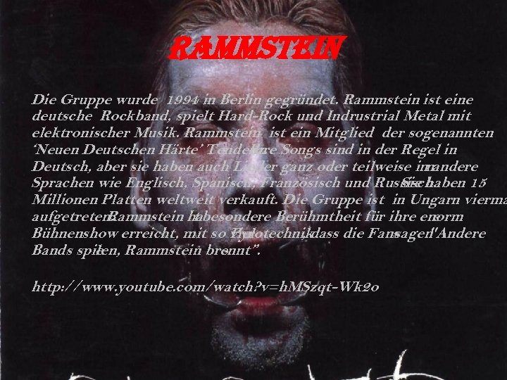 Rammstein Die Gruppe wurde 1994 in Berlin gegründet. Rammstein ist eine deutsche Rockband, spielt Hard-Rock und Indrustrial Metal mit elektronischer Musik. Rammstein ist ein Mitglied der sogenannten ‘Neuen Deutschen Härte’ Tendenz. Songs sind in der Regel in Ihre Deutsch, aber sie haben auch Lieder ganz oder teilweise innandere Sprachen wie Englisch, Spanisch, Französisch und Russisch. Sie haben 15 Millionen Platten weltweit verkauft. Die Gruppe ist in Ungarn vierma aufgetreten. Rammstein habesondere Berühmtheit für ihre enorm t e Bühnenshow erreicht, mit so viel Pyrotechnikdass die Fans , sagen "Andere Bands spieen, Rammstein brennt”. l http: //www. youtube. com/watch? v=h. MSzqt-Wk 2 o