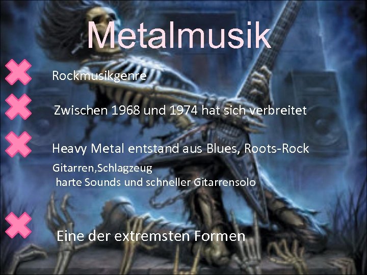 Metalmusik Rockmusikgenre Zwischen 1968 und 1974 hat sich verbreitet Heavy Metal entstand aus Blues, Roots-Rock Gitarren, Schlagzeug harte Sounds und schneller Gitarrensolo Eine der extremsten Formen
