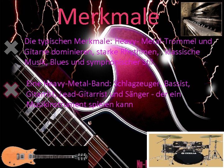Merkmale Die typischen Merkmale: Heavy- Metal-Trommel und Gitarre dominieren, starke Rhythmen, , klassische Musik, Blues und symphonischer Stil. Eine Heavy-Metal-Band: Schlagzeuger, Bassist, Gitarrist, Lead-Gitarrist und Sänger - der ein Musikinstrument spielen kann