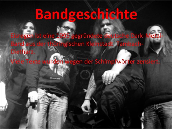 Bandgeschichte Eisregen ist eine 1995 gegründete deutsche Dark-Metal. Band aus der thüringischen Kleinstadt Tambach. Dietharz. Viele Texte wurden wegen der Schimpfwörter zensiert.