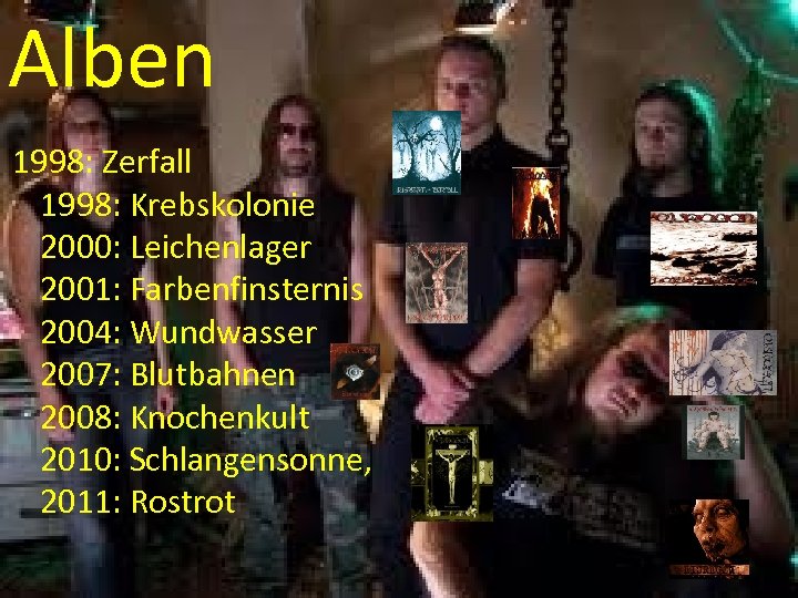 Alben 1998: Zerfall 1998: Krebskolonie 2000: Leichenlager 2001: Farbenfinsternis 2004: Wundwasser 2007: Blutbahnen 2008: Knochenkult 2010: Schlangensonne, 2011: Rostrot