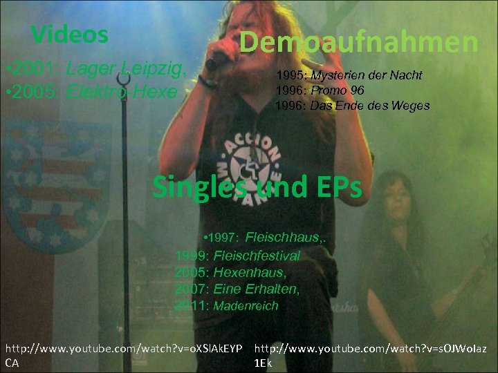Videos • 2001: Lager Leipzig, • 2005: Elektro-Hexe Demoaufnahmen 1995: Mysterien der Nacht 1996: Promo 96 1996: Das Ende des Weges Singles und EPs • 1997: Fleischhaus, . 1999: Fleischfestival 2005: Hexenhaus, 2007: Eine Erhalten, 2011: Madenreich http: //www. youtube. com/watch? v=o. XSl. Ak. EYP http: //www. youtube. com/watch? v=s. OJWo. Iaz 1 Ek CA