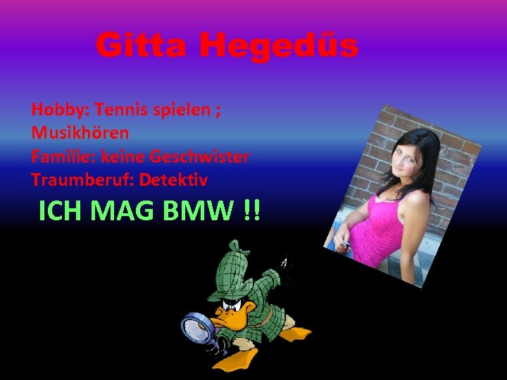Gitta Hegedűs Hobby: Tennis spielen ; Musikhören Familie: keine Geschwister Traumberuf: Detektiv ICH MAG BMW !!