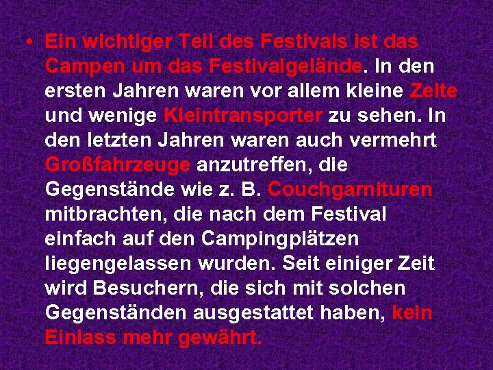 • Ein wichtiger Teil des Festivals ist das Campen um das Festivalgelände. In den ersten Jahren waren vor allem kleine Zelte und wenige Kleintransporter zu sehen. In den letzten Jahren waren auch vermehrt Großfahrzeuge anzutreffen, die Gegenstände wie z. B. Couchgarnituren mitbrachten, die nach dem Festival einfach auf den Campingplätzen liegengelassen wurden. Seit einiger Zeit wird Besuchern, die sich mit solchen Gegenständen ausgestattet haben, kein Einlass mehr gewährt.