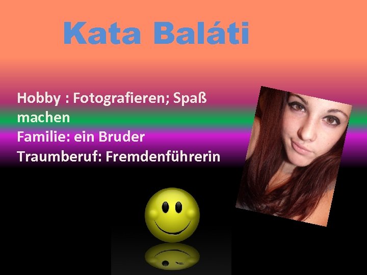Kata Baláti Hobby : Fotografieren; Spaß machen Familie: ein Bruder Traumberuf: Fremdenführerin