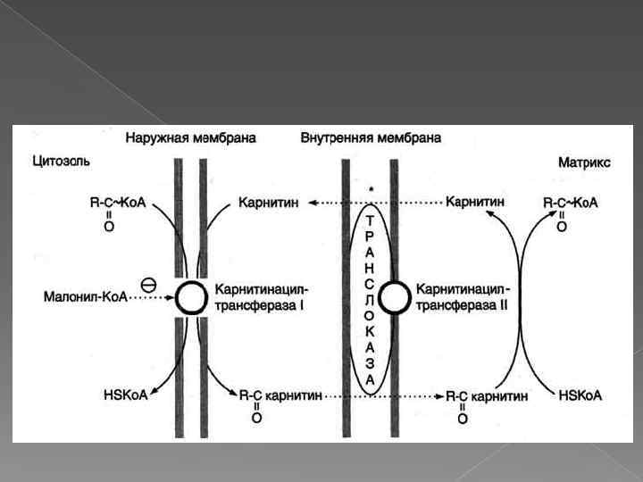 Жирные кислоты с короткой и средней длиной цепи (от 4 до 12 атомов углерода) могут проникать в матрикс митохондрий путём диффузии. Активация этих жирных кислот происходит в матриксе митохондрий. Жирные кислоты с длинной цепью, которые преобладают в организме человека (от 12 до 20 атомов углерода), активируются ацил-Ко. А синтетазами, расположенными на внешней мембране митохондрий.