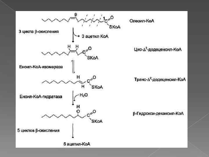 Окисление ненасыщенных жирных кислот Около половины жирных кислот в организме человека ненасыщенные. β-Окисление этих кислот идёт обычным путём до тех пор, пока двойная связь не окажется между третьим и четвёртым атомами углерода (рис. 8 -28). Затем фермент еноил-Ко. А изомераза перемещает двойную связь из положения 3 -4 в положение 2 -3 и изменяет цисконформацию двойной связи на транс-, которая требуется для р-окисления. В этом цикле Р-окисления первая реакция дегидрирования не происходит, так как двойная связь в радикале жирной кислоты уже имеется. Далее циклы βокисления продолжаются, не отличаясь от обычного пути.
