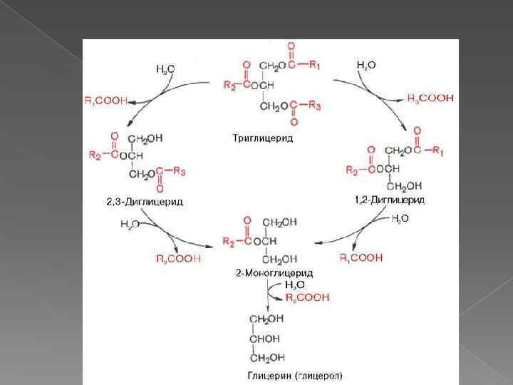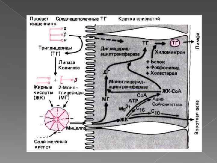 Особенности переваривания липидов у грудных детей Молоко содержит жиры, в состав которых входят в основном жирные кислоты с короткой и средней длиной алифатических цепей (4 -12 атомов углерода). Жиры в составе молока находятся уже в эмульгированном виде На жиры молока в желудке детей действует липаза, которая синтезируется в железах языка (липаза языка). Кроме того, в желудке детей грудного и младшего возраста вырабатывается желудочная липаза, которая активна при нейтральном значении р. Н, характерном для желудочного сока детей, и не активна у взрослых (р. Н желудочного сока -∼ 1, 5). Эта липаза гидролизует жиры, отщепляя, в основном, жирные кислоты у третьего атома углерода глицерола. Далее гидролиз жиров молока продолжается в кишечнике под действием панкреатической липазы. Жирные кислоты с короткой цепью, как водорастворимые, всасываются частично уже в желудке. Остальные жирные кислоты всасываются в тонком кишечнике.