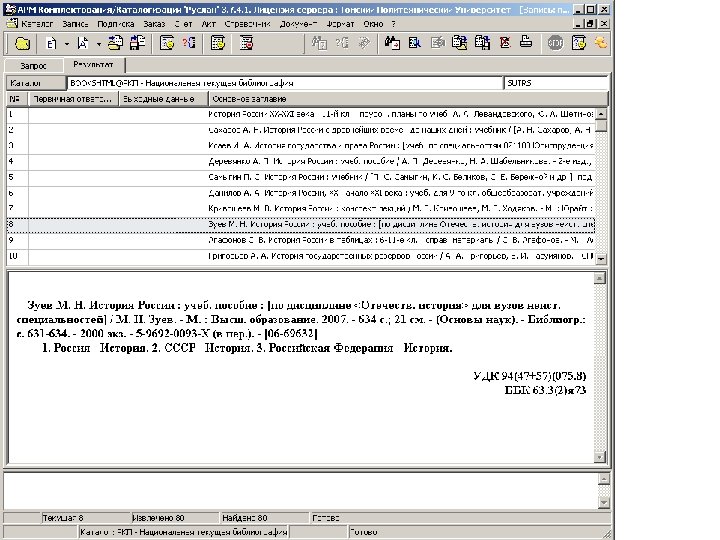 Как работать с сервисом из других систем? 1) Поиск по любому доступному для поиска атрибуту записей на сервере РКП. Например, Заглавие=история россии + Год издания=2007. Вы получаете в ответ результирующее множество записей. Записи приходят в "псевдомарке", т. е. описание в виде каталожной карточки (РКП) уложено в поле 200. В таком виде записи вполне пригодны для просмотра и принятия решения о необходимости заимствования конкретной (одиночной) записи в полном формате Rusmarc. 2) После принятия решения о заимствовании конкретной записи задается поисковый запрос, результатом которого станет только ОДНА заимствуемая запись (например, ISBN=5 -7057 -0565 -4). Одиночная запись будет извлечена в полном формате Rusmarc. Далее - "Скачать запись", "Импорт" (возможно, сразу с входом в режим редактирования).