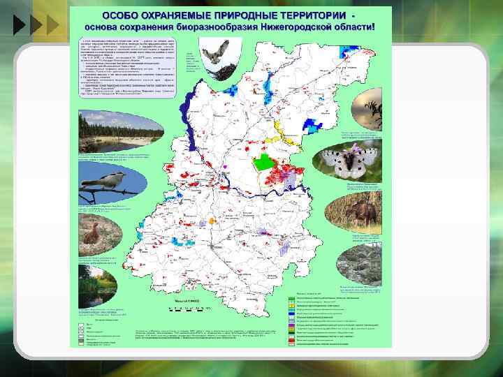 Число и площади ООПТ и их охранных зон в Нижегородской области Категории ООПТ Число ООПТ Площадь, га Государственные заповедники 1 46, 786 Природные парки 1 34, 983 Государственные заказники областного значения 16 277, 359 Памятники природы областного значения 380 150, 904 Памятники природы федерального значения 1 0, 012 Охраняемые объекты природного комплекса населенных пунктов 1 0, 016 Территории охраняемого ландшафта 1 4, 945 Итого 401 515, 005 Охранные зоны ООПТ 131 90, 203