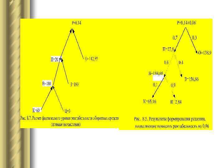 Управляющие предписания руководителям структурных подразделений Структурное подразделение, для которого формируются управляющие предписания Наименование показателя Обозна чение Значение Изменение ± исходное расчетн ое Руководство фирмы Рентабельность Р 0, 14 0, 2(жел аемое) 0, 06 Финансовый отдел Прибыль П 20 27, 8 Отдел снабжения, Зав. складом Оборотные средства (материальные запасы) О 142, 85 138, 9 -3, 95 Финансовый отдел Выручка В 180 184, 68 Финансовый отдел Затраты З 160 156, 86 -3, 14 Плановый отдел Объем производства К 60 65, 16 Отдел сбыта Цена продажи Ц 3 2, 84 -0, 16