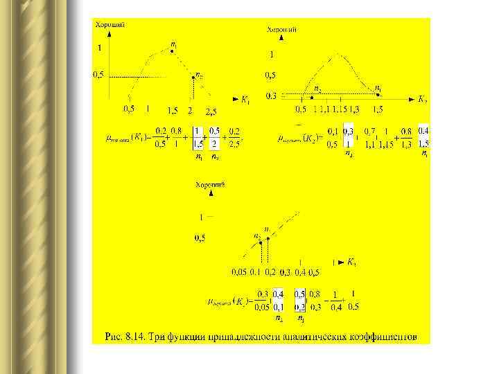Вычисление фактических значений функций принадлежности l Например, число 1 получено следующим образом: фактическое значение для предприятия равно 1, 52. Ближайшее теоретическое значение функции принадлежности равно 1 при значении данного коэффициента, равном 1, 5. Поэтому фактическое и теоретическое значение данного коэффициента будем считать равными, что позволяет использовать значение функции принадлежности, равное 1. Для второго предприятия фактическое значение равно 2, 07. Ближайшее значение функции принадлежности к данному числу равно 0, 5. Поэтому, используя его, определяем значение функции принадлежности, равное 0, 5.