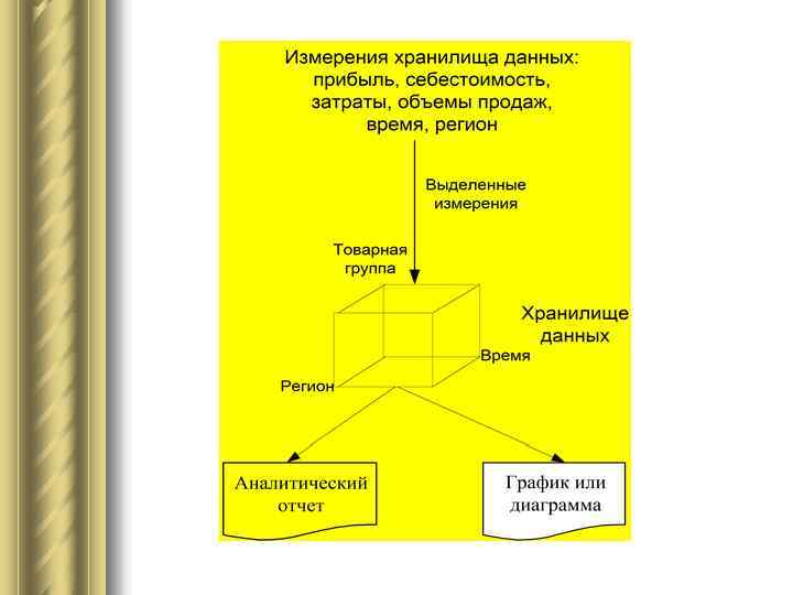 l 1. 4. Цель решения задачи: Необходимо определить следующие показатели финансово-экономической деятельности: Анализ объемов продаж и затрат на продажи в городах Тула и Москва. l месяц, в котором компания получила наименьший объем выручки от реализации товара; l регион, в котором выручка от реализации заданного товара была на протяжении всего периода максимальна; l месяц, в котором затраты на доставку заданного товара имели наибольшую величину. Необходимо составить аналитический отчет и выделить тренд по тем группам, по которым наблюдалось снижение продаж. 2. Описание входной информации. Входная информация расположена в Хранилище данных в соответствии с различными измерениями. Среди всех измерений хранилища выберем те, что будут использоваться для решения задачи. Этими измерениями будут: регион, время, объемы продаж, величина затрат, что графически представляется следующим образом: