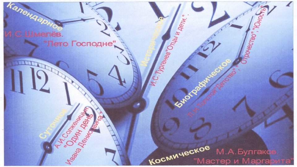 ОБРАЗЫ ХУДОЖЕСТВЕННОГО ВРЕМЕНИ Биографическое: детство, юность, зрелость, старость. ( «Детство» , «Отрочество» , «Юность» Л. Н. Толстого. ) Историческое: Характеристика смены эпох, поколений, крупных событий в жизни общества. ( «Отцы и дети» И. С. Тургенева. ) Космическое: Представление о вечности и вселенской истории. ( «Мастер и Маргарита» М. А. Булгакова. ) Календарное: Смена времени года, будней и праздников. (Русские народные сказки; И. С. Шмелев "Лето господне". ) Суточное: День и ночь, утро и вечер. (Рассказ «Один день Ивана Денисовича» А. И. Солженицына. ) Встречается в лирике и полное отсутствие значимого образа времени, как, например, в стихотворениях М. Ю. Лермонтова «И скучно и грустно» или Ф. И. Тютчева «Волна и дума» — временную координату таких произведений можно определить словом «всегда» . Бывает, напротив, и очень острое восприятие времени лирическим героем, что характерно, например, для поэзии И. Анненского, о чем говорят даже названия его произведений: «Миг» , «Тоска мимолетности» , «Минута» , не говоря уже о более глубинных образах.