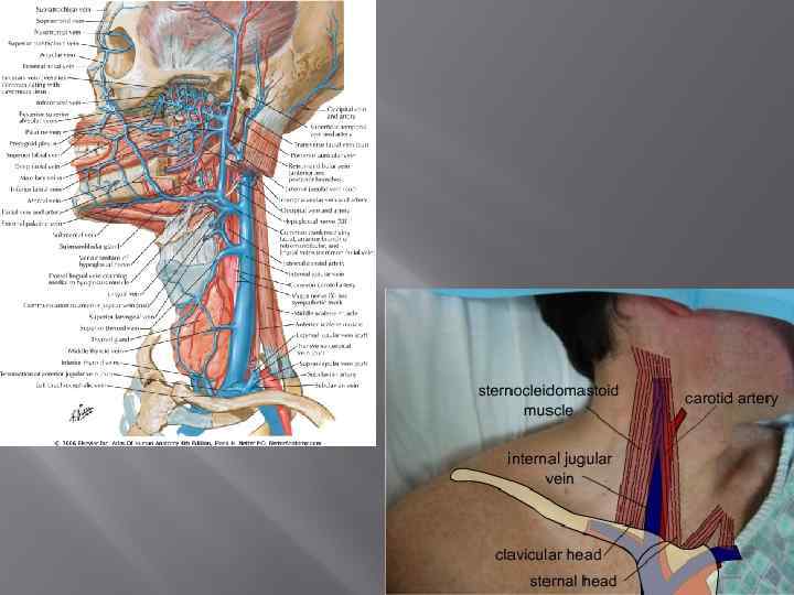 Топографическая анатомия внутренней яремной вены Начало - яремное отверстие черепа (продолжаясь из сигмовидного синуса) и идет по направлению к грудной клетке. Сонная артерия и блуждающий нерв проходят вместе в сонном влагалище. Перед тем как занять сначала латеральное, а затем переднелатеральное положение относительно внутренней сонной артерии, внутренняя яремная вена располагается позади артерии. Вена обладает способностью к значительному расширению, приспосабливаясь к увеличению притока крови, в основном за счет податливости ее латеральной стенки. Нижняя часть вены находится позади прикрепления грудинной и ключичной головок грудино-ключично-сосцевидной мышцы к соответствующим образованиям и плотно прижата к задней поверхности мышцы фасцией. Позади вены расположены предпозвоночная пластинка шейной фасции, предпозвоночные мышцы и поперечные отростки шейных позвонков. Hиже, у основания шеи, находятся подключичная артерия и ее разветвления, диафрагмальный и блуждающий нервы и купол плевры. В место слияния внутренней яремной и подключичной вен слева впадает грудной проток, а справа— правый лимфатический проток.