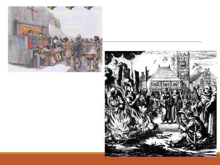 Инквизиция – суд церкви Трибунал католической церкви, осуществлявший сыскные, судебные и карательные функции; особые суды для борьбы с «еретиками» , вероотступниками, инакомыслящими. Введен в ХIII в. Инквизиция добилась права пытать всякого подозреваемого, попавшего в ее руки. «Признание» своей вины Примирение с церковью, отпущение грехов Пожизненное заключение либо безболезненное убийство Отрицание вины Сожжение на костре