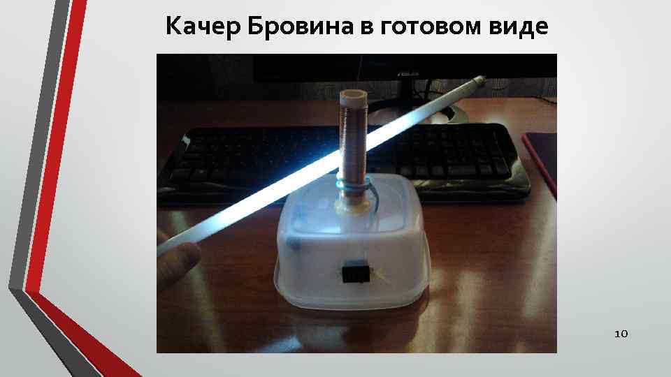 Качер Бровина Одним из вариантов трансформатора Тесла является качер Бровина. В его конструкцию могут входить полевые или биполярные транзисторы, реже – радиолампы (триоды и пентоды). Качер Бровина был изобретен в 1987 году советским радиоинженером Владимиром Ильичом Бровиным в качестве элемента электромагнитного компаса. 6