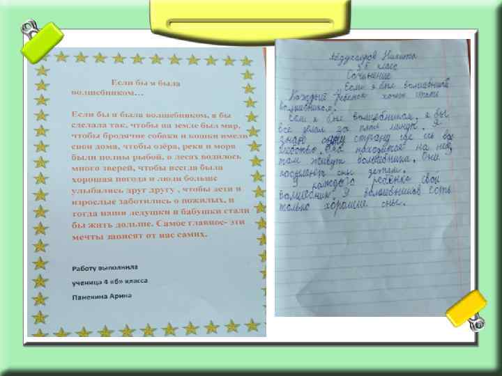 Конкурс сочинений на тему « Если был бы я Волшебник» • • Цель: развитие письменного творчества. Задачи: • • • Образовательные задачи: учить передавать свои впечатления ; формировать у детей стремление использовать в высказываниях различные типы предложений (простые и сложные, раскрывая содержание продолжением ; учить отбирать содержание в соответствии с выбранной темой; формировать у детей связной речи типа рассуждения; Развивающие задачи: развивать умение составлять творческие рассказы на предложенную тему: «Если был бы я Волшебник» — сочинение фантастического содержания» ; совершенствовать творческое, логическое мышление, фантазию и воображение детей; развивать умение находить причинно-следственные связи, развивать письменную речь детей. • •