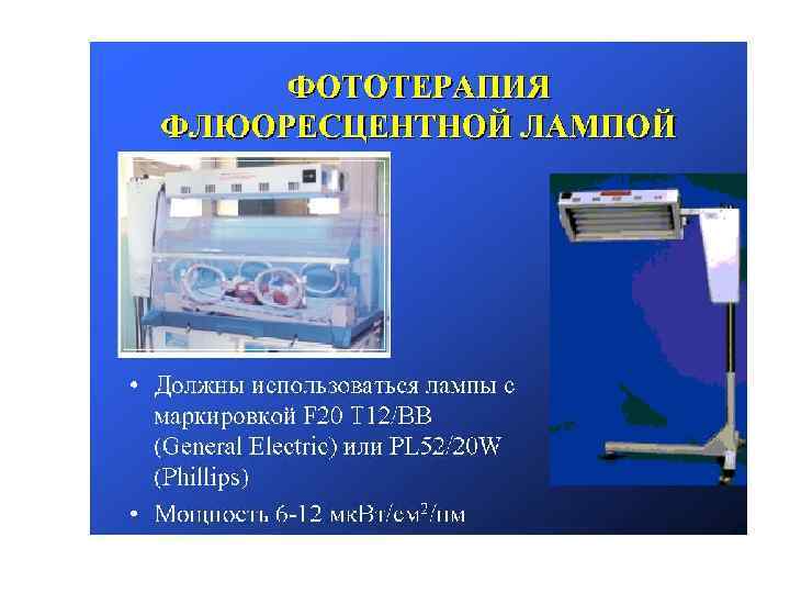 • Фототерапия – Фототерапию начать немедленно при появлении желтушной окраски кожи с одновременным забором крови для определения общего билирубина сыворотки. – Вопрос о прекращении или продолжении фототерапии решить по получении результатов общего билирубина сыворотки. – В случае неэффективности фототерапии на протяжении 4 -6 часов при определении уровня общего билирубина сыворотки крови, который отвечает уровням заменного переливания крови , провести заменное переливание крови. • Во время проведения фототерапии необходимо обращать внимание на возможные ее осложнения для своевременного их устранения: – – Диарея Ожоги Дегидратация Сыпь на коже