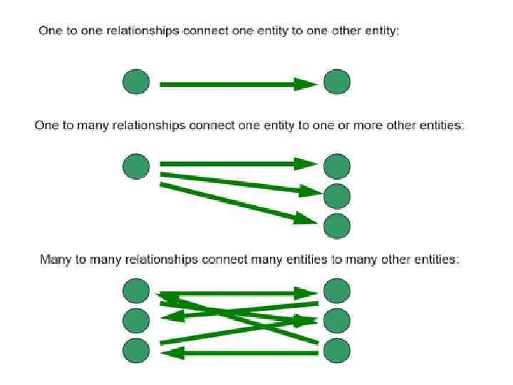 § Relationships. Two tables/entities in a database may relate to each other using one or more common attribute. There are three types of relationships among tables namely, One-to-one, one-tomany, many-to-many.