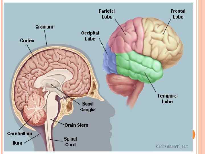 THE BRAIN IS ALSO DIVIDED INTO SEVERAL LOBES: • THE FRONTAL LOBES ARE RESPONSIBLE FOR PROBLEM SOLVING AND JUDGMENT AND MOTOR FUNCTION. • THE PARIETAL LOBES MANAGE SENSATION, HANDWRITING, AND BODY POSITION. • THE TEMPORAL LOBES ARE INVOLVED WITH MEMORY AND HEARING. • THE OCCIPITAL LOBES CONTAIN THE BRAIN'S VISUAL PROCESSING SYSTEM. THE BRAIN IS SURROUNDED BY A LAYER OF TISSUE CALLED THE MENINGES. HE SKULL T (CRANIUM) HELPS PROTECT THE BRAIN FROM INJURY.