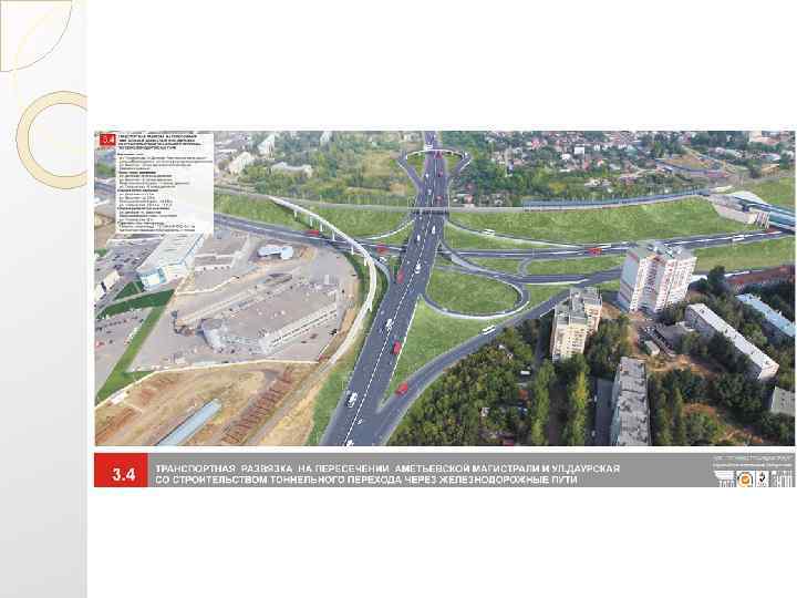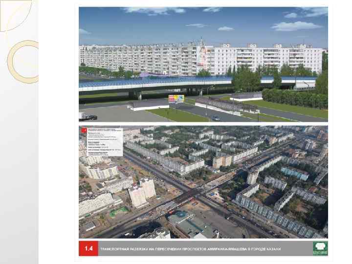 Транспортная развязка на пересечении проспектов Амирхана –Ямашева в городе Казани Протяженность улиц: проспекта Амирхана — 1, 32 км проспекта Ямашева — 0, 33 км Площадь асфальтобетонных покрытий: 72, 570 кв. м Расчетная скорость передвижения: 80 км/ч (40 км/ч) Длина путепровода: эстакада — 219, 35 м подпорные стенки — 2 х158 м Габарит путепровода Г 2 х10, 5+1, 26 Схема путепровода/площадь покрытия 5 х42 / 4410 кв. м