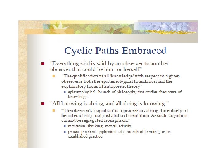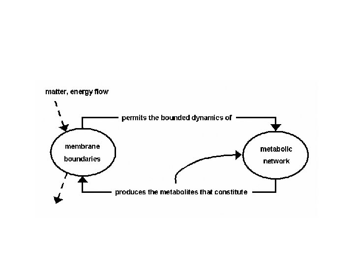 autopoiesis • • • “. . . autopoiesis attempts to capture the mechanism or process that generates the identity of the living and thus to serve as a categorical distinction of living from nonliving, not more not less. ” F. Varela