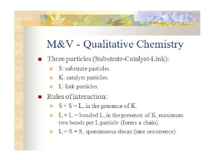 Гипотеза • До появления клеточной мембраны первичный бульон был населен свободными РНК – репликаторами • Происходил отбор по скорости репликации • В нек. момент скорость репликации одних видов стала зависеть от присутствия других видов (кооперация) • Возникли кооперативные цепочки. Когда они замкнулись, образовался автокаталитический цикл, который победил в первичном бульоне, так, как его приспособленность выше • Автокаталитические циклы и молекулярная эволюция стали взаимными храповиками процесса эволюционного усложнения, порождения экосистемного уровня.