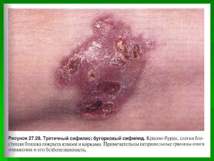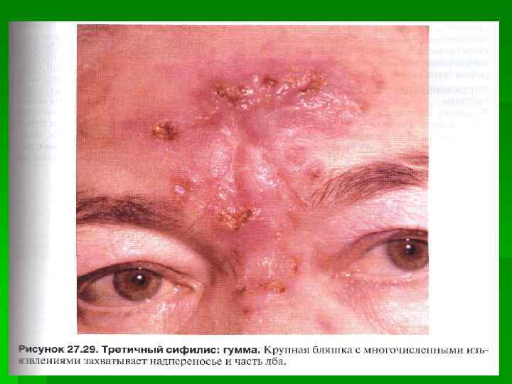 Третичный сифилис ● Развивается при классическом течении инфекции спустя примерно 5 лет с момента заражения ● В последние годы встречается редко Особенности сифилидов третичного сифилиса ● Малозаразительность ● Мономорфность ● Асимметричность ● Медленное развитие и регресс ● Отсутствие субъективных ощущений ● Отсутствие островоспалительных явлений