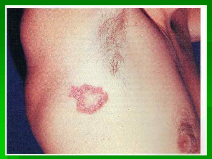 Третичная розеола Фурнье ● Бледно-розовые кольца диаметром от 5 см до 15 см. ● Локализуется симметрично, на коже туловища. ● При разрешении образуется нежная атрофия кожи.
