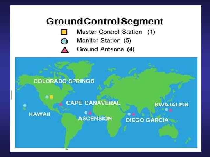 Структура GPS • GPS состоит из трех основных частей - сегментов 2. Космический сегмент 3. Сегмент пользователей Станции Слежения Колорадо Спрингс 1. Сегмент контроля и управления О-в Диего Гарсия О-в Вознесения Атолл Кваджелейн Гавайи Колорадо-Спрингс