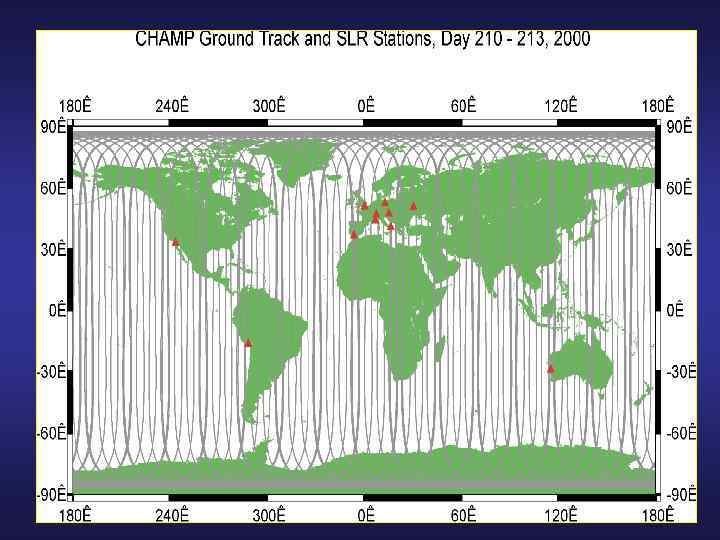 CHAMP mission benefits for a fundamental progress in gravity field recovery: · near-polar orbit (i=87 o) for a complete coverage of the Earth · continuous high-low GPS satellite-to-satellite tracking and a very low orbit (450 km, decaying to 300 km) · on-board accelerometer for a direct measurement of hard-to-model non-gravitational surface forces, mainly air drag · long mission lifetime (5 years) to resolve temporal gravity variations