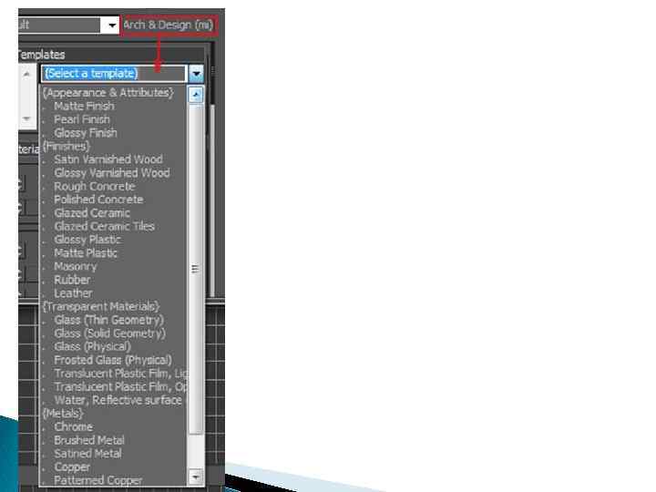 Arch and Design — если нам необходимо создать материал обладающий реалистичными физическими свойствами, то Arch and Design наиболее подходящий. В его состав входит достаточное количество предустановленных шаблонов различных материалов, которые можно выбрать сразу, не создавая отдельно: