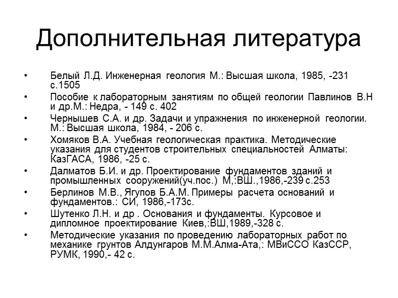 Дополнительная литература Белый Л.Д. Инженерная геология М.: Высшая школа, 1985, -231 с.1505 Пособие к лабораторным занятиям по общей геологии Павлинов В.Н и др.М.: Недра, - 149 с. 402 Чернышев С.А. и др. Задачи и упражнения по инженерной геологии. М.: Высшая школа, 1984, - 206 с. Хомяков В.А. Учебная геологическая практика. Методические указания для студентов строительных специальностей Алматы: КазГАСА, 1986, -25 с. Далматов Б.И. и др. Проектирование фундаментов зданий и промышленных сооружений(уч.пос.) М,:ВШ.,1986,-239 с.253 Берлинов М.В., Ягупов Б.А.М. Примеры расчета оснований и фундаментов.: СИ, 1986,-173с. Шутенко Л.Н. и др . Основания и фундаменты. Курсовое и дипломное проектирование Киев,:ВШ,1989,-328 с. Методические указания по проведению лабораторных работ по механике грунтов Алдунгаров М.М.Алма-Ата,: МВиССО КазССР, РУМК, 1990,- 42 с.