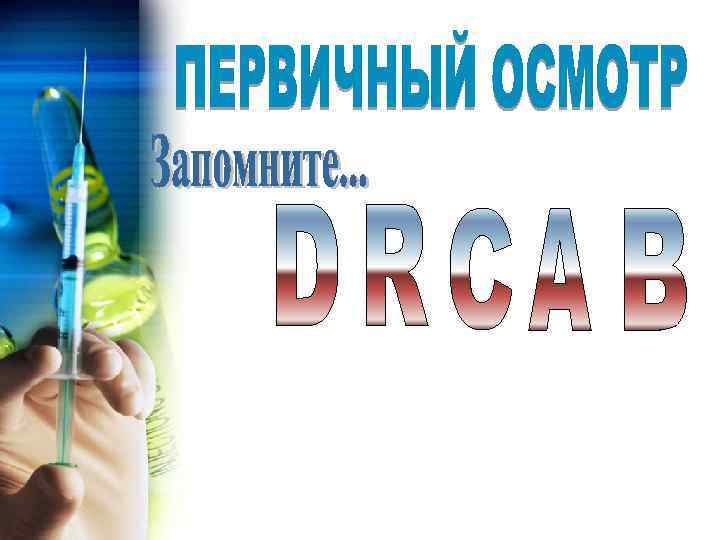 D = Danger R = Response Опасность Ответ C = Circulation Кровообращение A = Airway Дыхательные пути B = Breathing Дыхание