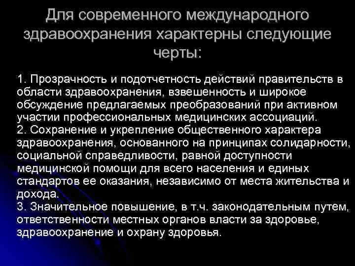 Для современного международного здравоохранения характерны следующие черты: 1. Прозрачность и подотчетность действий правительств в области здравоохранения, взвешенность и широкое обсуждение предлагаемых преобразований при активном участии профессиональных медицинских ассоциаций. 2. Сохранение и укрепление общественного характера здравоохранения, основанного на принципах солидарности, социальной справедливости, равной доступности медицинской помощи для всего населения и единых стандартов ее оказания, независимо от места жительства и дохода. 3. Значительное повышение, в т. ч. законодательным путем, ответственности местных органов власти за здоровье, здравоохранение и охрану здоровья.