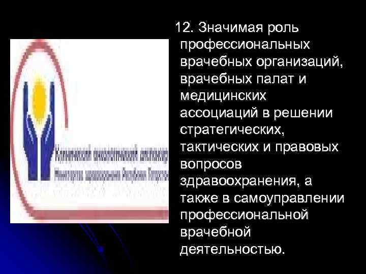 12. Значимая роль профессиональных врачебных организаций, врачебных палат и медицинских ассоциаций в решении стратегических, тактических и правовых вопросов здравоохранения, а также в самоуправлении профессиональной врачебной деятельностью.