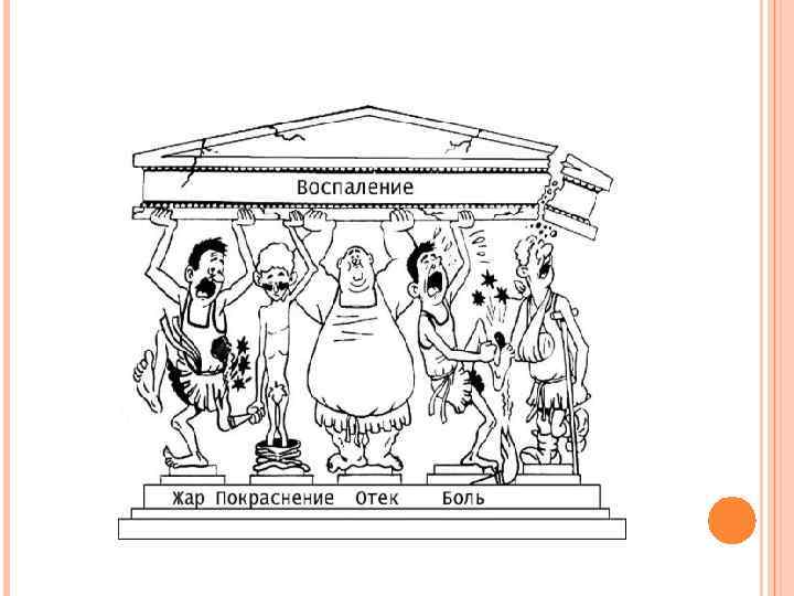 очаг воспаления характеризуется пятью внешними (местными) проявлениями: краснотой (rubor), припухлостью (tumor), повышением температуры, или жаром (calor), болезненностью, или болью (dolor), нарушением функции functio laesa)