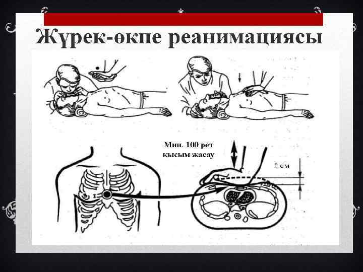 ЖҮРЕК-ӨКПЕ РЕАНИМАЦИЯСЫНЫҢ НЕГІЗГІ ЕРЕЖЕЛЕРІ Науқасты тегіс жерге жатқызып, басын барынша шалқайтып, аяқ жағын көтеріңкі етіп қою керек. Массаж жасаушы адам алақандарын бірінің үстіне, бірін қояды. Алақанның негізі төс сүйегі мен семсер тәрізді шеміршектің қиылысқан жерінен екі саусақ қиғаш жоғары тұруы керек. Қолды тік, шынтақ буынында бүкпей ұстап, дене салмағымен омыртқаға қарай 4 -5 см ығыстырып, ырғақпен басады. Төс сүйегін омыртқаға қарай жаншудың ұзақтығы, жаншу аралығындағы уақытпен бірдей болуы тиіс, оның жиілігі минутына 90 рет. Массаж жасаушы қолын төстен алмауы керек. Өкпені жасанды желдендіру үшін Сафардың үш әдісін қолданамыз олар: науқастың басын барынша шалқайтып, астыңғы жағын алға қарай жылжытып, аузын ашу. Науқастың ауыз қуысын толық қарап, жасанды тістері немесе бөгде заттар болса, саусақтармен алып тастау керек. Науқастың аузына дем жіберу үшін, мұрнынан қысып, аузынан ауа үрлейді. Әр 5 массаждық қимылға, ауа үрлеудің жиілігі минутына 1 реттен келеді. Жүрекке тікелей емес массаж дұрыс жасалу үлгісі Электроимпульсты терапия. Бастапқы разряд 200 Дж. Әсер болмаған жағдайда қуатты біртіндеп 200 -360 Дж дейін жоғарылату. Тыныс жолдары өткізгіштігін қалыптастыру. Жасанды тыныстандырудың тиімді болуына тыныс жолдары өткізгіштігінің таза болуы өте маңызды орын алады. Мүмкіндігінше 100% оттегіні қолдану керек және кеңірдек интубациясын жүргізу қажет. Асқазандағы сұйықтықтардың өңеш арқылы ағып, тыныс жолдарына кетіп қалмауы үшін Селлик әдісі қолданылады. Реанимациялық шаралардың әсерін үнемі бақылап отыру керек. Оны тері жабындылары мен шырышты қабаттардың түстерінің өзгеруінен, қарашықтардың тарылуынан және жарыққа реакциясының пайда болуынан, кенеттен тыныстың пайда болып, оның реттелуінен және ұйкы артериясында пульстің пайда болуынан білуге болады.