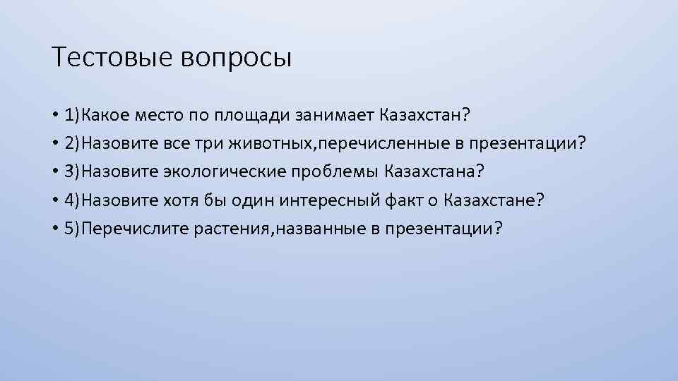 Тестовые вопросы • 1)Какое место по площади занимает Казахстан? • 2)Назовите все три животных, перечисленные в презентации? • 3)Назовите экологические проблемы Казахстана? • 4)Назовите хотя бы один интересный факт о Казахстане? • 5)Перечислите растения, названные в презентации?