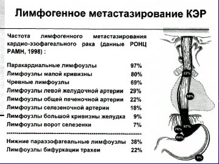 Схематическое изображение путей метастазирования небольшой опухоли кардиоэзофогальной области.