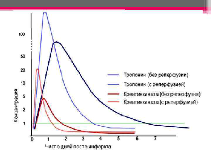 Следует отметить, что повышение уровня тропонинов не является высоко специфичным и может быть ложноположительным при некоторых состояниях: • • • • • Хроническая и острая почечная дисфункция Тяжелая застойная сердечная недостаточность Гипертонический криз Тахи- или брадиаритмии Тромбоэмболия легочной артерии, высокая легочная гипертензия Воспалительные заболевания, например миокардит Острые неврологические заболевания, включая инсульт и субарахноидальное кровотечение Расслоение стенки аорты, порок аортального клапана или гипертрофическая кардиомиопатия Ушиб сердца, аблация, стимуляция, кардиоверсия или биопсия миокарда Гипотиреоз Кардиомиопатия Такоцубо (стресс-индуцированная кардиомиопатия) Инфильтративные заболевания, в том числе амилоидоз, гемохроматоз, саркоидоз, склеродермия Токсическое действие лекарств (адриамицин, 5 -фторурацил, герцептин, змеиный яд) Ожоги >30%площади поверхности тела Рабдомиолиз Критическое состояние (особенно дыхательная недостаточность или сепсис). Наряду с тропонинами на миокардиальное повреждение может указывать повышение уровня МВ КФК, определение которой обычно проводится непосредственно при поступлении в стационар.
