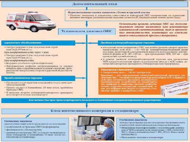 • 4. Наркотические анальгетики. При интенсивном длительном болевом синдроме в грудной клетке возможно применение морфина (в/в или п/к)(I A). • 5. Блокаторы кальциевых каналов. У больных с предполагаемой/подтвержденной вазоспастической стенокардией назначаются блокаторы кальциевых каналов и нитраты, назначения β-блокаторов в этом случае нужно избегать (IIa B). • 6. Ацетилсалициловая кислота. АСК при первичном осмотре пациента с подозрением на ОКС назначается в нагрузочной дозе 150– 300 мг не с «кишечнорастворимым» покрытием(I A). • 7. Ингибиторы Р 2 Y 12 -рецепторов тромбоцитов. Назначение второго антиагреганта в дополнение к АСК: Тикагрелор в нагрузочной дозировке 180 мг рекомендуется к назначению при отсутствии противопоказаний (внутричерепное кровоизлияние в анамнезе или продолжающееся кровотечение) у всех пациентов с ОКСбп. ST среднего и высокого риска (с повышенным уровнем тропонина) (I A) или 16 Клопидогрел в нагрузочной дозировке 300 мг (если предполагается консервативная стратегия) или 600 мг (если предполагается инвазивная стратегия) рекомендован пациентам, которые не могут принимать тикагрелор или нуждаются в дополнительном назначении непрямых антикоагулянтов (фибрилляция предсердий)(I B). • 8. Антикоагулянтная терапия назначается всем пациентам при установлении диагноза ОКС. В качестве антикоагулянтов в острой фазе ОКСбп. ST допустимо применение следующих препаратов: –фондапаринукс (п/к введение)(I B); – низкомолекулярный гепарин (эноксапарин, в/в болюс и п/к введение)(I B); – НФГ (должен вводиться только в/в) (I B); Фондапаринукс (2, 5 мг/сут п/к) рекомендуется как препарат, имеющий оптимальный профиль эффективность/безопасность у пациентов с ОКСбп. ST вне зависимости от выбранной тактики лечения. При невозможности назначения фондапаринукса альтернативой для проведения антикоагулянтной терапии являются эноксапарин или НФГ. Не допускается смена одного назначенного вида гепарина на другой, поскольку это повышает риск развития кровотечений.