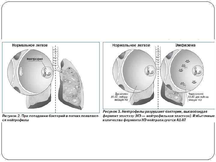 В последнее время получила широкое распространение концепция нарушения баланса между протеазами и их ингибиторами, хотя в развитии эмфиземы не отрицается значение хронического бронхита, сопровождающегося постоянным кашлем. В возникновении указанного дисбаланса имеют значение как наследственные, также и внешние факторы (курение, контакт с некоторыми веществами, хронические воспалительные процессы). Протеазы макрофагов и нейтрофилов оказывают разрушающее действие на белковые структурные элементы альвеол. Разрушение альвеолярных стенок и поддерживающих структур ведёт к образованию значительно расширенных воздушных пространств. Принято считать, что отсутствие тканевого каркаса нижних дыхательных путей приводит к их сужению вследствие динамического спадения, но время выдоха на уровне малых лёгочных объёмов (экспираторный коллапс бронхов). Кроме того, нарушения альвеолярно -капиллирной мембраны снижают диффузионную способность лёгких за счёт уменьшения площади дыхательной поверхности лёгких. В норме активность протеиназ регулируется ингибиторами [наибольшей активностью среди них обладает синтезируемый в печени а, -ингибитор протеиназ (а, -антитрипсин)]. У некоторых пациентов наблюдают усиление активности нейтрофильной эластазы, катепсина. металлопротеаз и снижения активности антипротеаз. Эти состояния часто сопровождаются развитием эмфиземы лёгких.