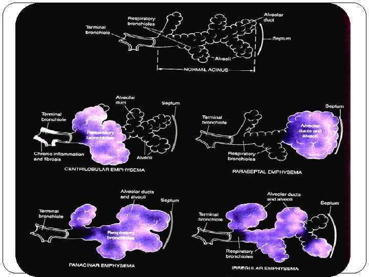 Классификация эмфиземы легких патогенетическая форма • первичная • вторичная • диффузную • локализованную морфологические особенности • Панлобулярную • центролобулярную • Периацинарную • буллезную