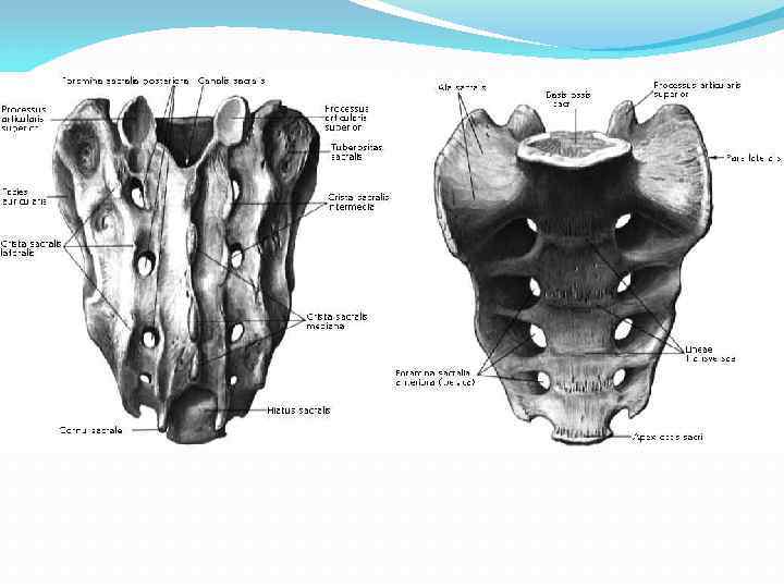 Анатомические особенности строения крестцовых позвонков Крестец состоит из пяти позвонков, которые срастаются в одну кость в юношеском возрасте. Крестец имеет треугольную форму. . Выделяют основание крестца, верхушку крестца, его тазовую поверхность, обращенную вперед и дорсальную поверхность, ориентированную назад. В области основания вперед выдается закругленный угол - мыс. На вогнутой тазовой поверхности отчетливо видны четыре поперечные линии, следы сращения тел крестцовых позвонков. С каждой стороны на уровне этих линий имеются тазовые крестцовые отверстия. Пять продольных гребней образовались при сращении отростков крестцовых позвонков. Непарный срединный крестцовый гребень - это сросшиеся остистые отростки. Парные промежуточные гребни являются результатом сращения суставных отростков, а латеральные крестцовые гребни образовались при сращении поперечных отростков. На верхнебоковых отделах крестца находятся ушковидные поверхности для сочленения с одноименными поверхностями подвздошных костей. С каждой стороны между ушковидной поверхностью и латеральным гребнем имеется крестцовая бугристость. Позвоночные отверстия сросшихся крестцовых позвонков образует крестцовый канал, который оканчивается внизу крестцовой щелью. По бокам эта щель ограничена крестцовыми рогами - рудиментом суставных отростков.